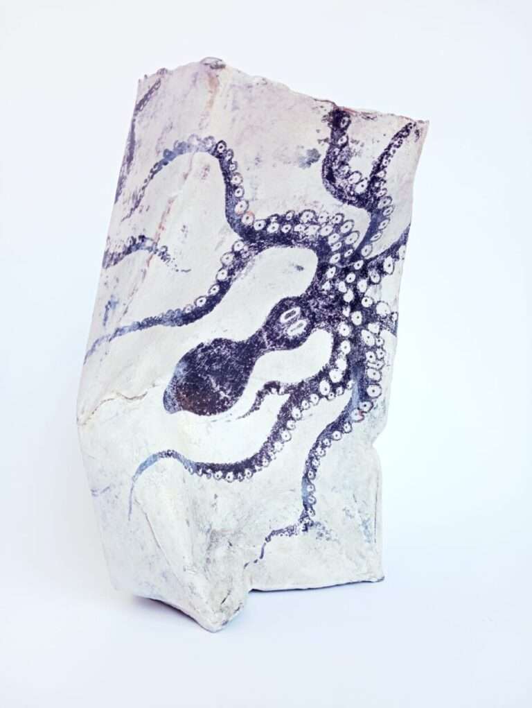 Una tanica schiacciata, fragile e solida insieme, si staglia come un reperto anacronistico: realizzata in terracotta biancastra, evoca la forma anonima e industriale degli oggetti di scarto contemporanei. Ma qualcosa si oppone alla lettura veloce: sulla sua superficie, come affiorata da un tempo lontano, si estende l’immagine di un polpo minoico. Le sue braccia si muovono sinuose, come se danzassero tra le pieghe della memoria e del futuro.